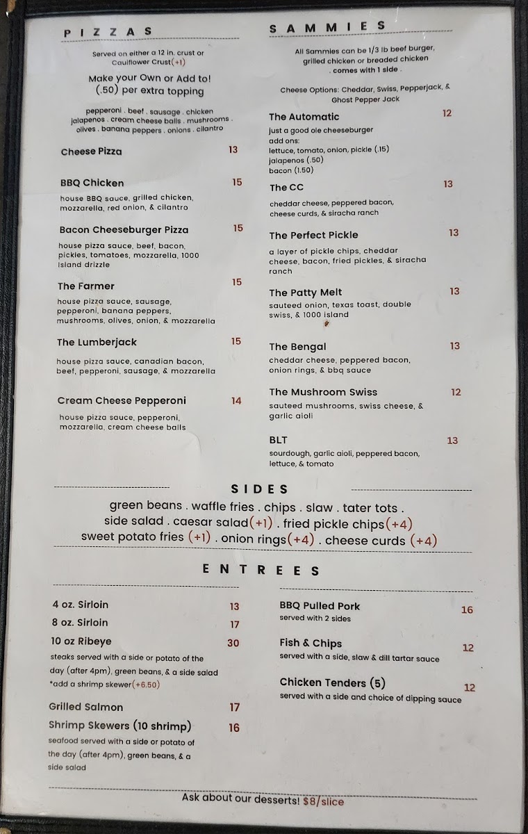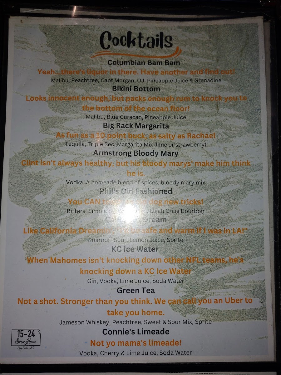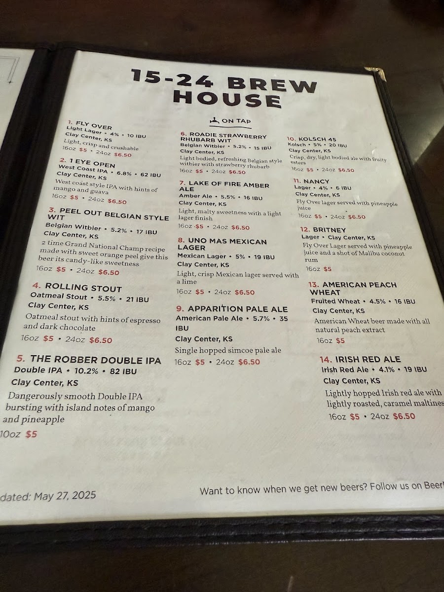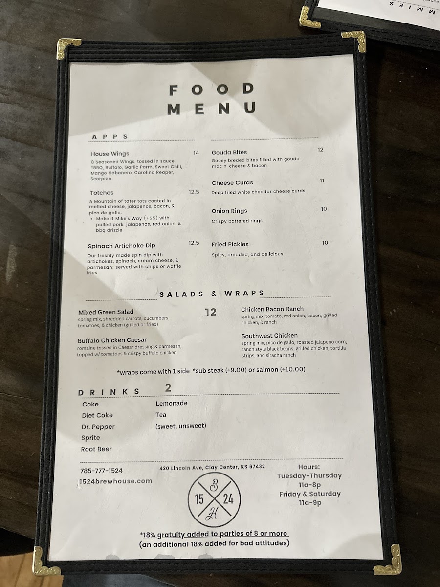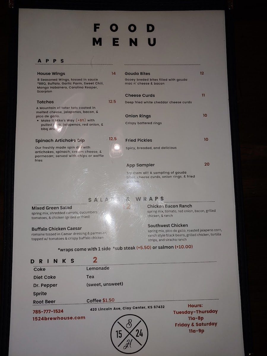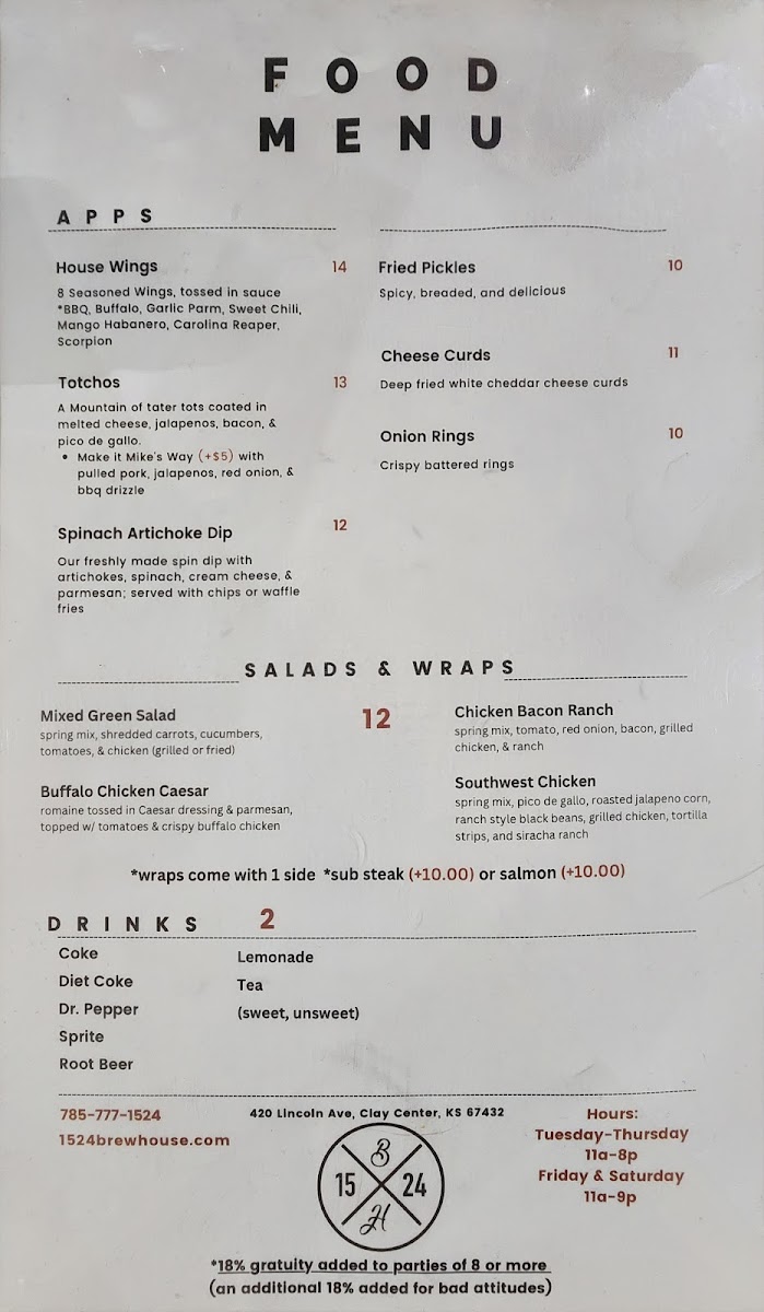When you're in Clay Center, KS, be sure to stop by for a one-of-a-kind experience at the 15-24 Brew House Menu. Located at 420 Lincoln Ave, this spot brings a cozy, inviting atmosphere where every dish and drink feels thoughtfully crafted. Whether you’re in the mood for something light and fresh or something hearty and satisfying, the menu has a wide variety of options that cater to every craving. From tasty starters that pair perfectly with their signature brews to flavorful entrees that hit the spot, you’re sure to find something that excites your taste buds. Don’t forget to try their rotating selection of seasonal specials-they’re a true treat and highlight of the menu. With a laid-back vibe and a focus on quality ingredients, it’s the perfect place to unwind with friends, family, or just on your own. Come for the food, stay for the experience!
